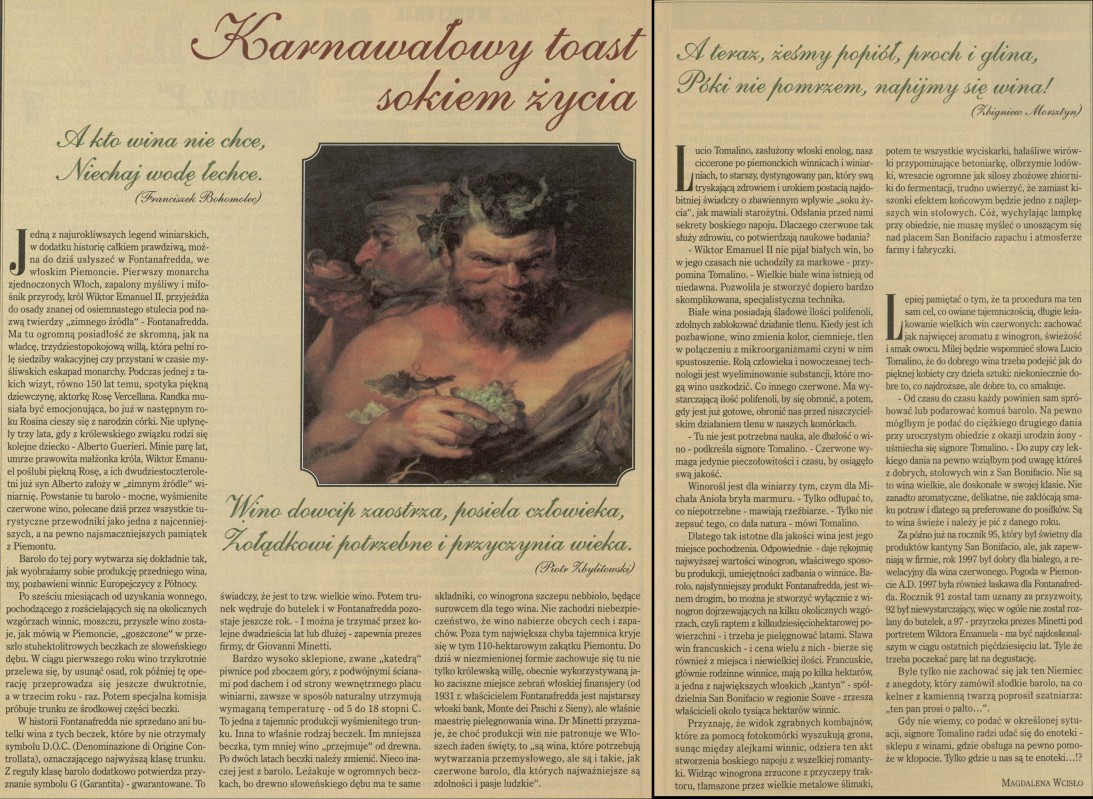 Archiwum / Artykuł nr 2746 (27/1998) 2/2 Podziel się Tytuł Karnawałowy toast sokiem życia Autor Magdalena Wcisło Kategoria Artykuł Artykuł z numeru 2746 (2747/1998) Data wydania 8 lutego 1998 Tagi wino