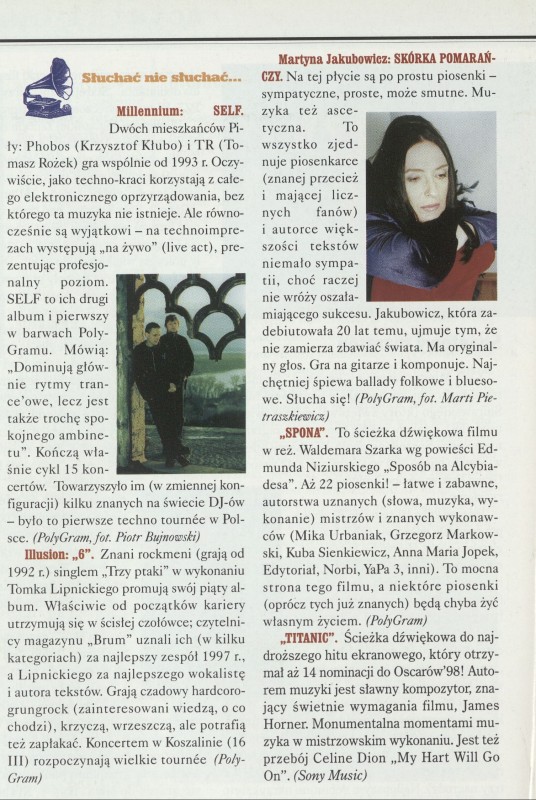 Archiwum / Słuchać albo nie słuchać nr 2751 (27/1998) 143/150 Podziel się Tytuł Słuchać nie słuchać.. Rubryka Słuchać albo nie słuchać Artykuł z numeru 2751 (2752/1998) Data wydania 15 marca 1998 Tagi muzyka płyta