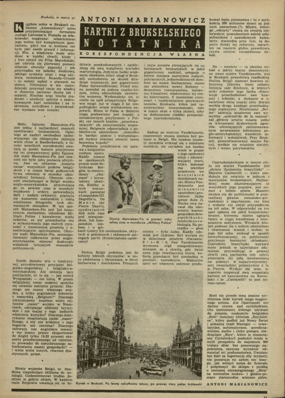Archiwum / korespondencja własna "Przekroju" nr 105 (15/1947) 39/47 Podziel się Tytuł Kartki z brukselskiego notatnika Autor Antoni Marianowicz Rubryka korespondencja własna "Przekroju" Artykuł z numeru 105 (15/1947) Data wydania 19 kwietnia 1947 Tagi Belgia Bruksela straty wojenne II wojna światowa