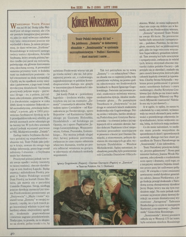 Archiwum / Kurier Warszawski nr 2752 (27/1998) 1666/1695 Podziel się Tytuł Kurier Warszawski Autor Lucjan Kydryński Rubryka Kurier Warszawski Artykuł z numeru 2752 (2753/1998) Data wydania 22 marca 1998 Tagi teatr