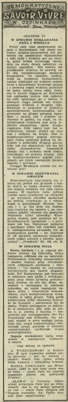 Archiwum / Demokratyczny savoir-vivre nr 105 (15/1947) 1972/1977 Podziel się Tytuł W sprawie odkładania noża i widelca Autor Jan Kamyczek Rubryka Demokratyczny savoir-vivre Artykuł z numeru 105 (15/1947) Data wydania 19 kwietnia 1947 Tagi savoir-vivre