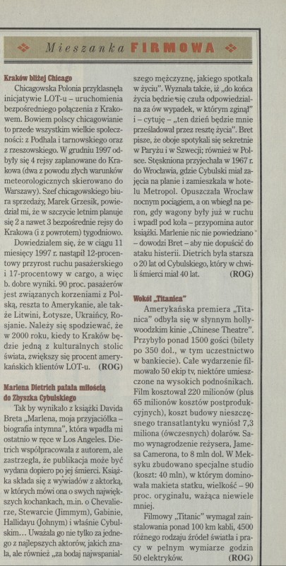 Archiwum / Mieszanka firmowa nr 2753 (27/1998) 13/49 Podziel się Tytuł Mieszanka firmowa Rubryka Mieszanka firmowa Artykuł z numeru 2753 (2754/1998) Data wydania 29 marca 1998 Tagi loty Titanic Dietrich