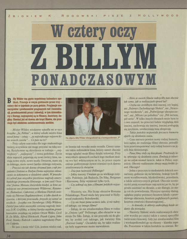 Archiwum / Wywiad nr 2753 (27/1998) 04/16 Podziel się Tytuł W cztery oczy z Billym ponadczasowym Autor Zbigniew K. Rogowski Kategoria Wywiad Artykuł z numeru 2753 (2754/1998) Data wydania 29 marca 1998 Tagi Wilder