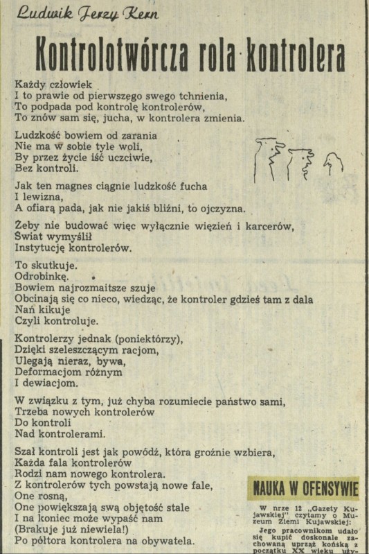 Archiwum / Rozmaitości [old] nr 1966 (07/1983) 80871/123969 Podziel się Tytuł Kontrolotwórcza rola kontrolera Autor Ludwik Jerzy Kern Rubryka Rozmaitości [old] Artykuł z numeru 1966 (7/1983) Data wydania 13 lutego 1983 Tagi wiersz