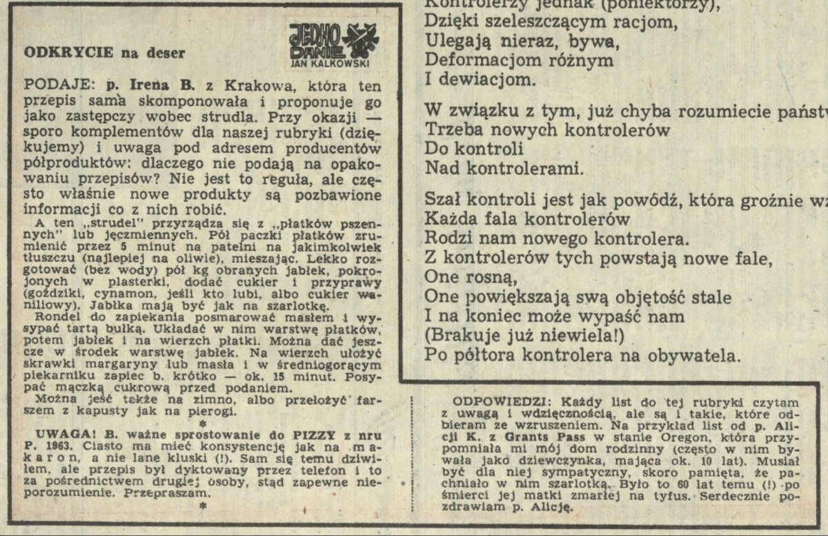 Archiwum / Jedno danie nr 1966 (07/1983) 02/10 Podziel się Tytuł Odkrycie na deser Autor Jan Kalkowski Rubryka Jedno danie Artykuł z numeru 1966 (7/1983) Data wydania 13 lutego 1983 Tagi gastronomia kulinaria przepis kulinarny strudel