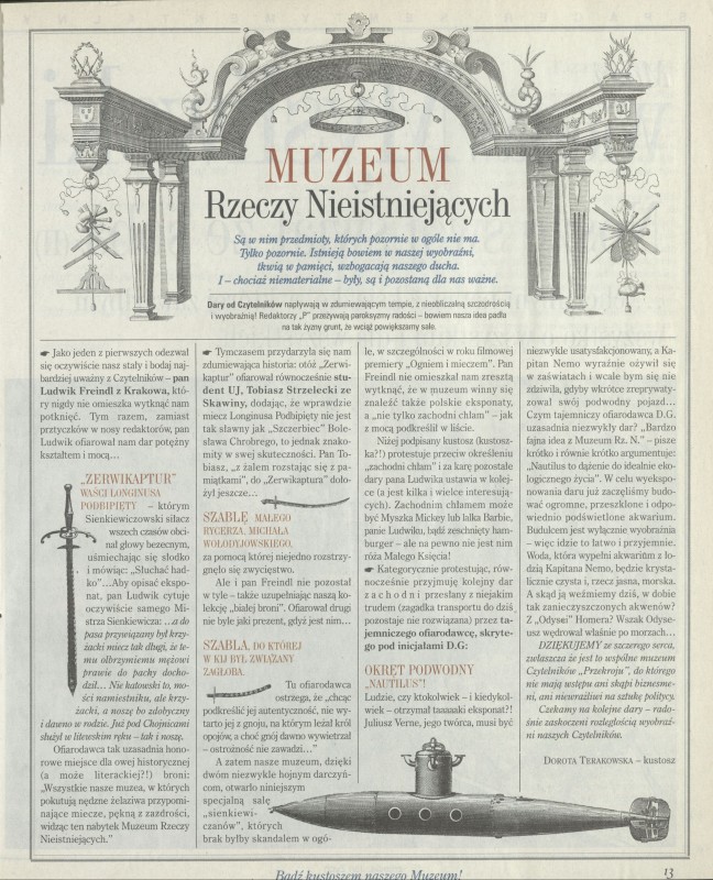 Archiwum nr 2784 (27/1998) 120049/123969 Podziel się Tytuł Muzeum Rzeczy Nieistniejących Autor Dorota Terakowska Artykuł z numeru 2784 (2785/1998) Data wydania 1 listopada 1998 Tagi szable
