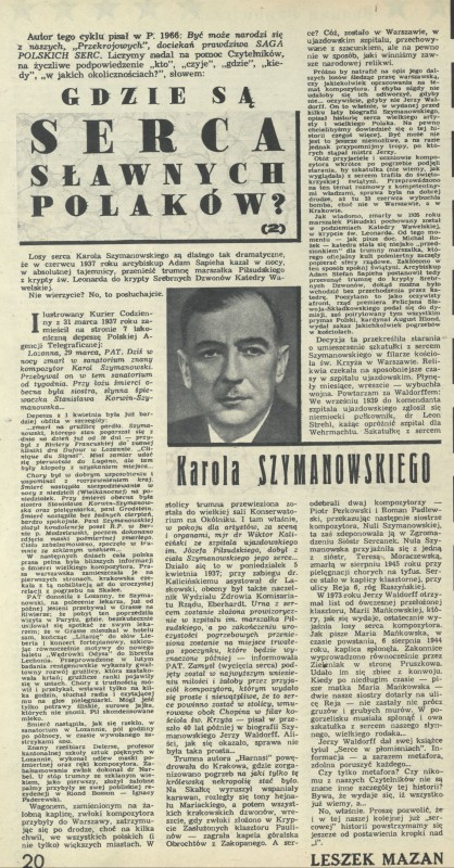 Archiwum / Artykuł nr 1969 (10/1983) 80995/123969 Podziel się Tytuł Gdzie są serca sławnych Polaków? (2) Karola Szymańskiego Autor Leszek Mazan Kategoria Artykuł Artykuł z numeru 1969 (10/1983) Data wydania 6 marca 1983