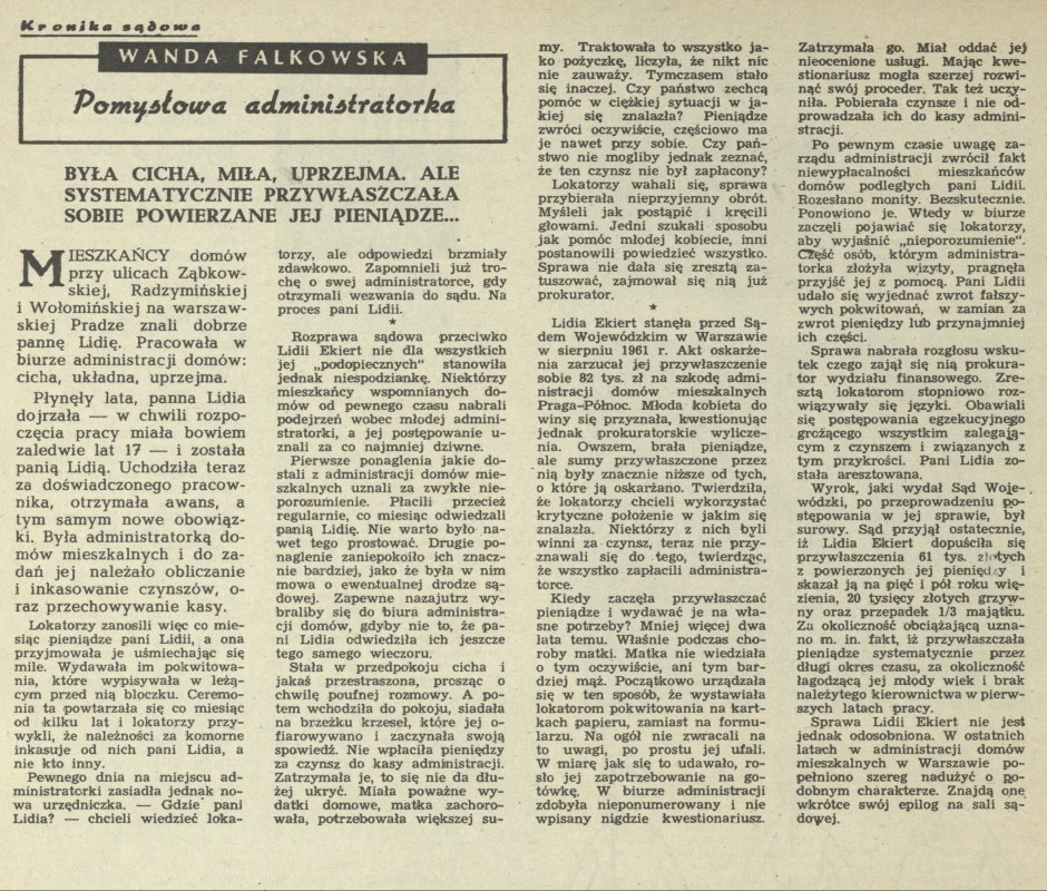 Archiwum / Kronika sądowa nr 861 (41/1961) 22/29 Podziel się Tytuł Pomysłowa administratorka Autor Wanda Falkowska Rubryka Kronika sądowa Artykuł z numeru 861 (41/1961) Data wydania 8 października 1961 Tagi Sąd Wojewódzki w Warszawie