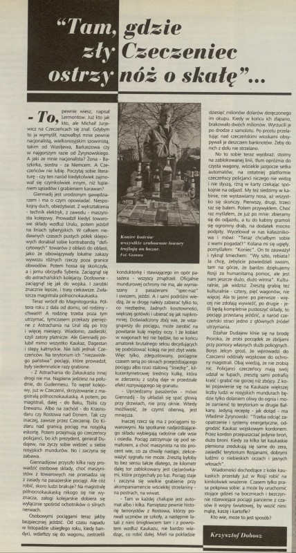Archiwum / Opowiadanie nr 2556 (25/1994) 19/36 Podziel się Tytuł Tam gdzie zły Czeczeniec ostrzy nóż o skałę Autor Krzysztof Dobosz Kategoria Opowiadanie Artykuł z numeru 2556 (25/1994) Data wydania 19 czerwca 1994
