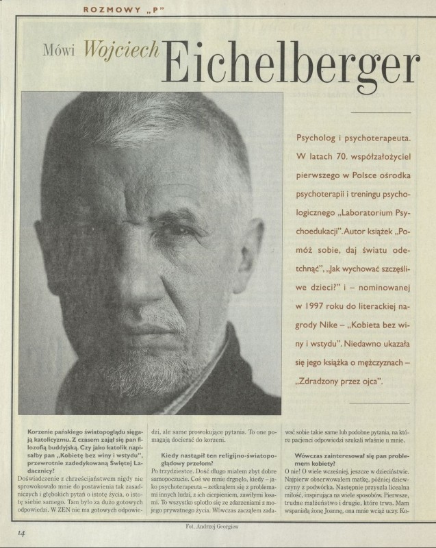 Archiwum / Rozmowy „Przekroju” nr 2793 (27/1999) 08/12 Podziel się Tytuł Mówi Wojciech Eichelberger Autor Katarzyna Kubisiowa Rubryka Rozmowy „Przekroju” Artykuł z numeru 2793 (2794/1999) Data wydania 3 stycznia 1999 Tagi psycholog słuchanie
