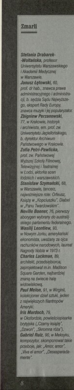 Archiwum nr 2801 (28/1999) 121156/123969 Podziel się Tytuł Zmarli Artykuł z numeru 2801 (2802/1999) Data wydania 28 lutego 1999 Tagi Zofia Petri-Pawlicka