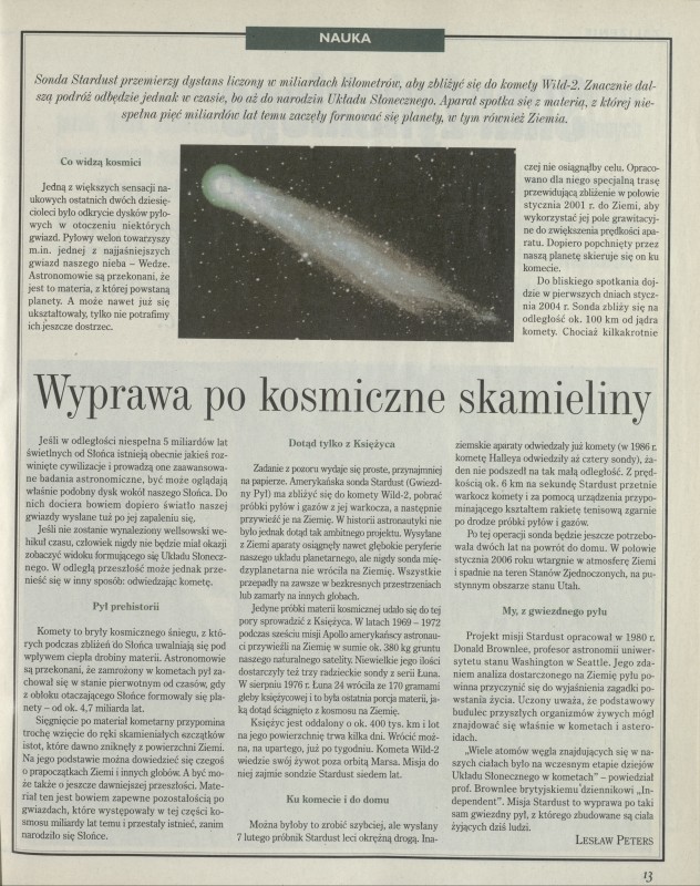 Archiwum / Artykuł nr 2801 (28/1999) 32/311 Podziel się Tytuł Wyprawa po kosmiczne skamieliny Autor Lesław Peters Kategoria Artykuł Artykuł z numeru 2801 (2802/1999) Data wydania 28 lutego 1999 Tagi gwiezdny pył