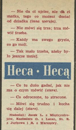 Archiwum / Heca hecą nr 2251 (31/1988) 62/409 Podziel się Tytuł Heca hecą Rubryka Heca hecą Artykuł z numeru 2251 (31/1988) Data wydania 31 lipca 1988 Tagi powiedzenia powiedzonka