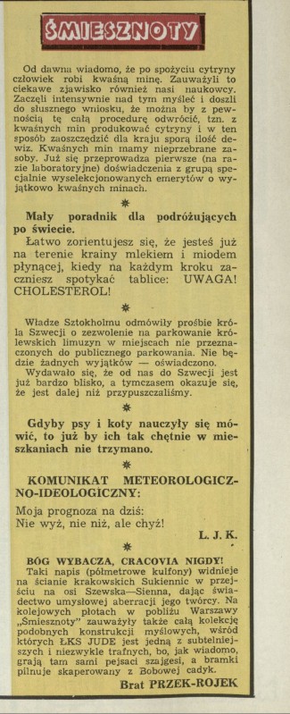 Archiwum / Rozmaitości nr 2472 (24/1992) 26/203 Podziel się Tytuł Śmiesznoty Autor Brat PRZEK-ROJEK Kategoria Rozmaitości Artykuł z numeru 2472 (2473/1992) Data wydania 8 listopada 1992