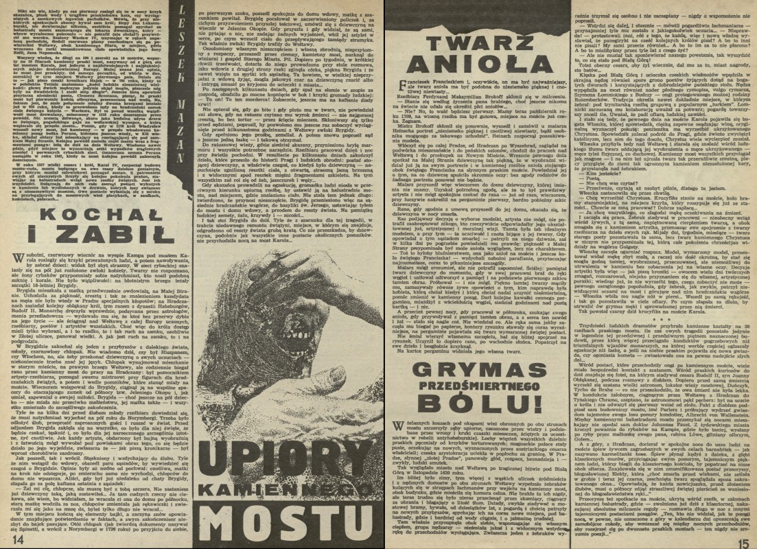 Archiwum / Artykuł nr 2272 (52/1988) 377/380 Podziel się Tytuł Kochał i zabił. Upiory Kamiennego Mostu Autor Leszek Mazan Kategoria Artykuł Artykuł z numeru 2272 (52/1988) Data wydania 18 grudnia 1988 Tagi Czechy Praga Most Karola Wacław IV Brokoff Biała Góra legendy historia