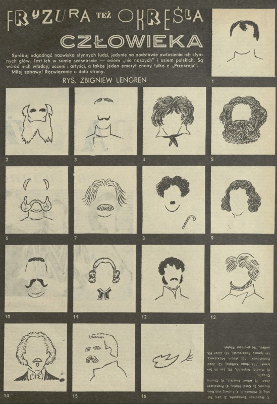 Archiwum / Łamigłówki Przekroju nr 2272 (52/1988) 33/35 Podziel się Tytuł Fryzura też określa człowieka Autor Zbigniew Lengren Rubryka Łamigłówki Przekroju Artykuł z numeru 2272 (52/1988) Data wydania 18 grudnia 1988 Tagi zagadka zgadywanka łamigłówka