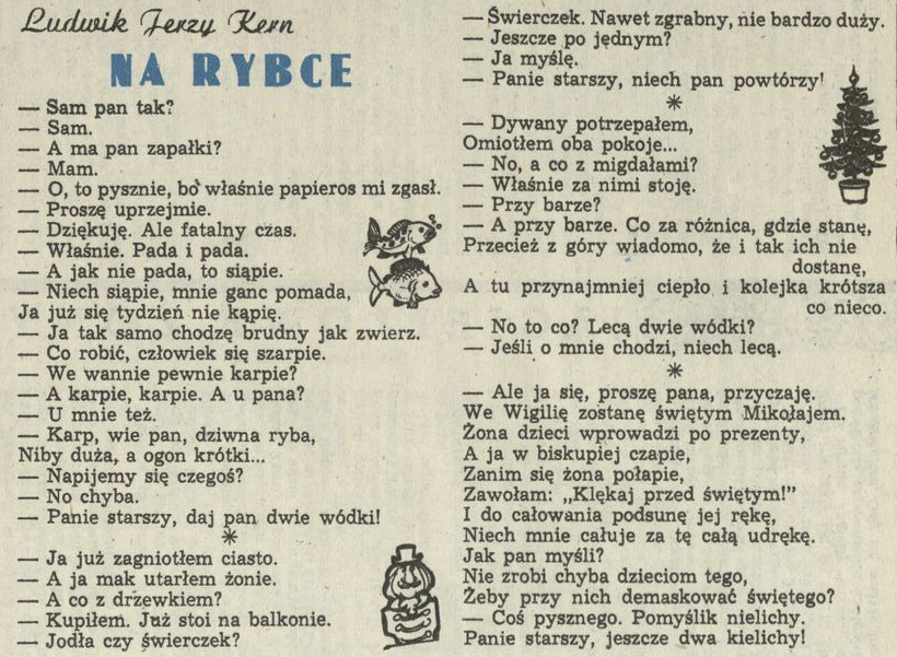 Archiwum / Rozmaitości [old] nr 2272 (52/1988) 9/9 Podziel się Tytuł Na rybce Autor Ludwik Jerzy Kern Rubryka Rozmaitości [old] Artykuł z numeru 2272 (52/1988) Data wydania 18 grudnia 1988 Tagi święta Święta Bożego Narodzenia Wigilia wiersz