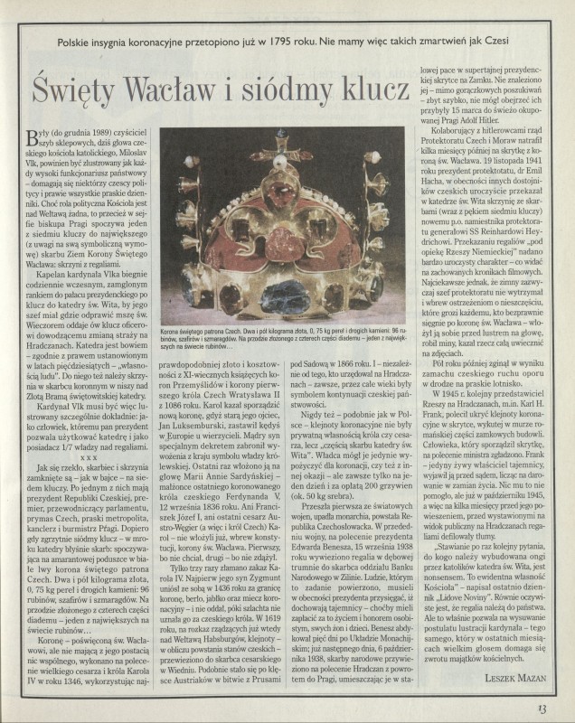 Archiwum / Artykuł nr 2808 (28/1999) 18/26 Podziel się Tytuł Święty Wacław i siódmy klucz Autor Leszek Mazan Kategoria Artykuł Artykuł z numeru 2808 (2809/1999) Data wydania 18 kwietnia 1999 Tagi insygnia