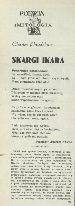 Archiwum / Poezja nr 2439 (24/1992) 85/396 Podziel się Tytuł Skargi Ikara Autor Charles Baudelaire Andrzej Nowak Kategoria Poezja Artykuł z numeru 2439 (2440/1992) Data wydania 22 marca 1992 Tagi poezja i mitologia wiersz