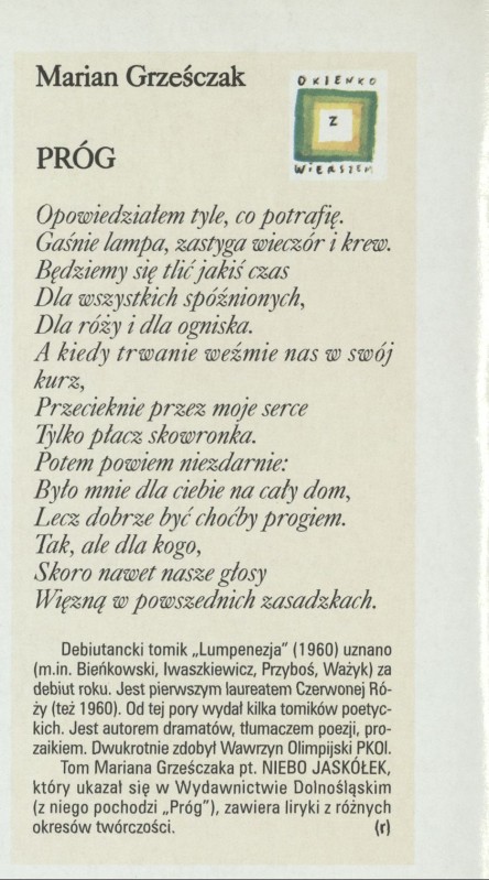 Archiwum / Okienko z wierszem nr 2818 (28/1999) 609/669 Podziel się Tytuł Próg Autor Marian Grześczak Rubryka Okienko z wierszem Artykuł z numeru 2818 (2819/1999) Data wydania 27 czerwca 1999 Tagi wiersz