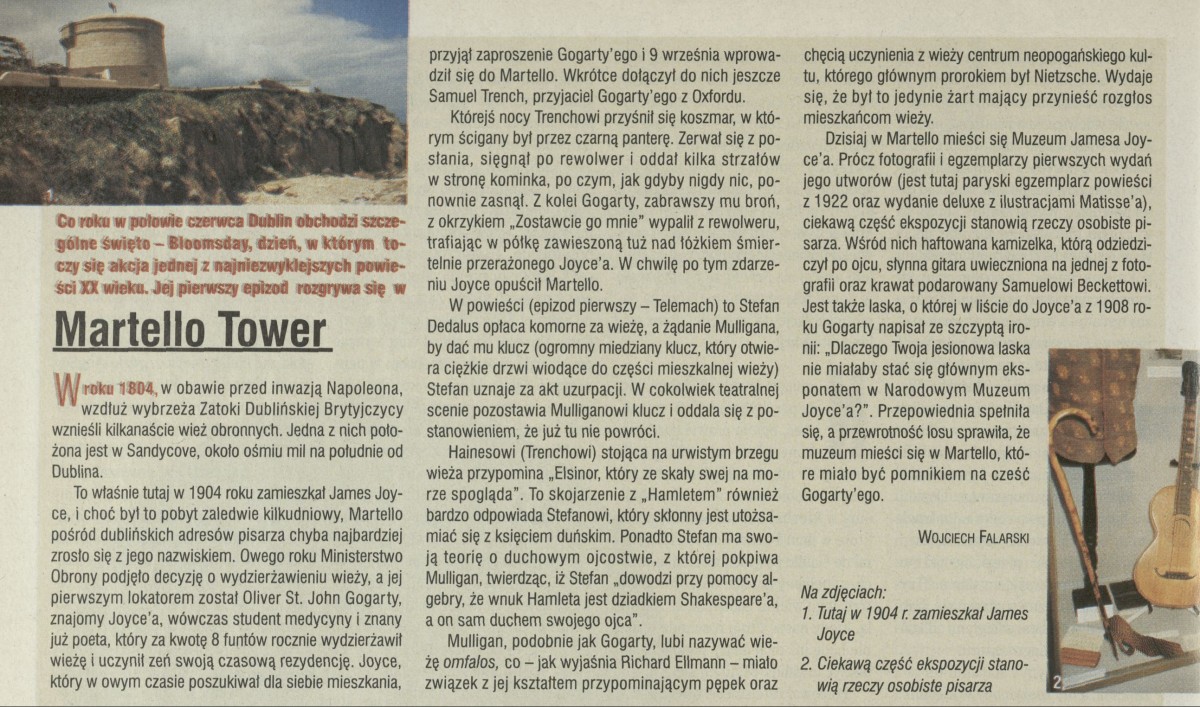 Archiwum / Relacja nr 2818 (28/1999) 4/4 Podziel się Tytuł Martello Tower Autor Wojciech Falarski Kategoria Relacja Artykuł z numeru 2818 (2819/1999) Data wydania 27 czerwca 1999 Tagi James Joyce