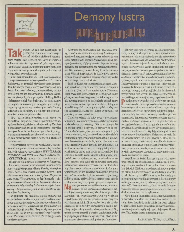 Archiwum / Artykuł nr 2818 (28/1999) 130/267 Podziel się Tytuł Demony lustra Autor Katarzyna Turaj-Kalińska Kategoria Artykuł Artykuł z numeru 2818 (2819/1999) Data wydania 27 czerwca 1999 Tagi dzieci