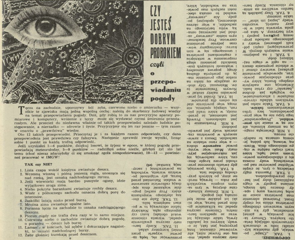 Archiwum / Rozrywka nr 2010-11 (51-52/1983) 2066/2082 Podziel się Tytuł Czy jesteś dobrym prorokiem czyli o przepowiadaniu pogody Autor et Kategoria Rozrywka Artykuł z numeru 2010-11 (51/1983) Data wydania 18 grudnia 1983 Tagi pogoda meteorologia test