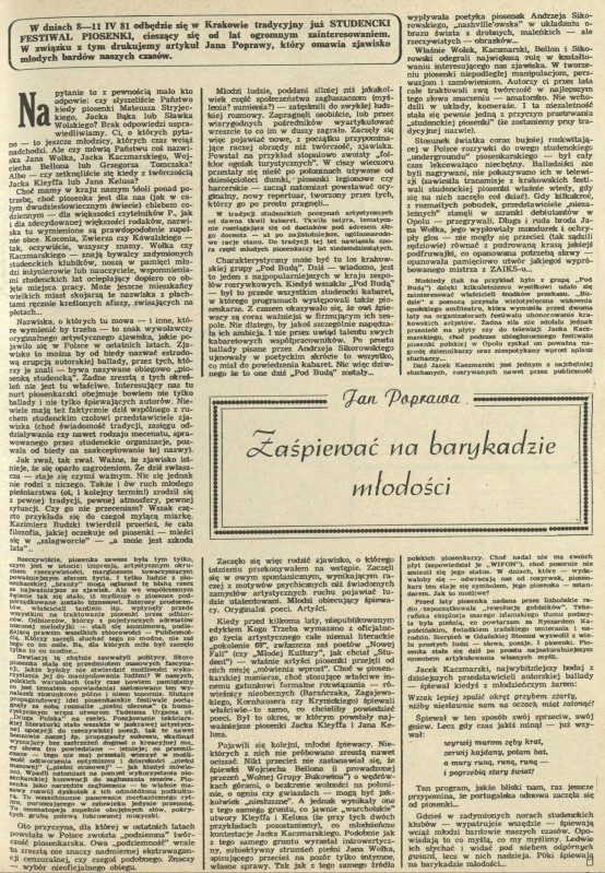 Archiwum / Kultura nr 1878 (14/1981) 165/1658 Podziel się Tytuł Zaśpiewać na barykadzie młodości Autor Jan Poprawa Kategoria Kultura Artykuł z numeru 1878 (14/1981) Data wydania 5 kwietnia 1981 Tagi Studencki Festiwal Piosenki