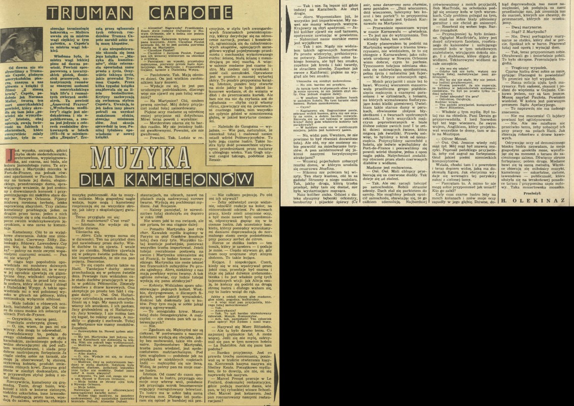 Archiwum / Opowiadanie nr 1878 (14/1981) 08/90 Podziel się Tytuł Muzyka dla kameleonów Autor Truman Capote Olekinaz H. Kategoria Opowiadanie Artykuł z numeru 1878 (14/1981) Data wydania 5 kwietnia 1981 Tagi literatura amerykańska