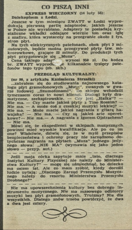 Archiwum / Co piszą inni nr 516 (09/1955) 14/336 Podziel się Tytuł Co piszą inni Rubryka Co piszą inni Artykuł z numeru 516 (9/1955) Data wydania 27 lutego 1955 Tagi "Express Wieczorny" "Przegląd kulturalny"