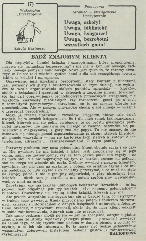 Archiwum / Artykuł nr 2458 (24/1992) 5/9 Podziel się Tytuł Bądź znajomym klienta Autor Kaliopeusz Kategoria Artykuł Artykuł z numeru 2458 (2459/1992) Data wydania 2 sierpnia 1992 Tagi książki