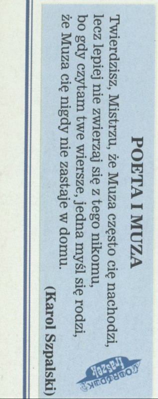 Archiwum nr 2822 (28/1999) 27/44 Podziel się Tytuł Poeta i muza Autor Karol Szpalski Artykuł z numeru 2822 (2823/1999) Data wydania 25 lipca 1999 Tagi ogródek fraszek