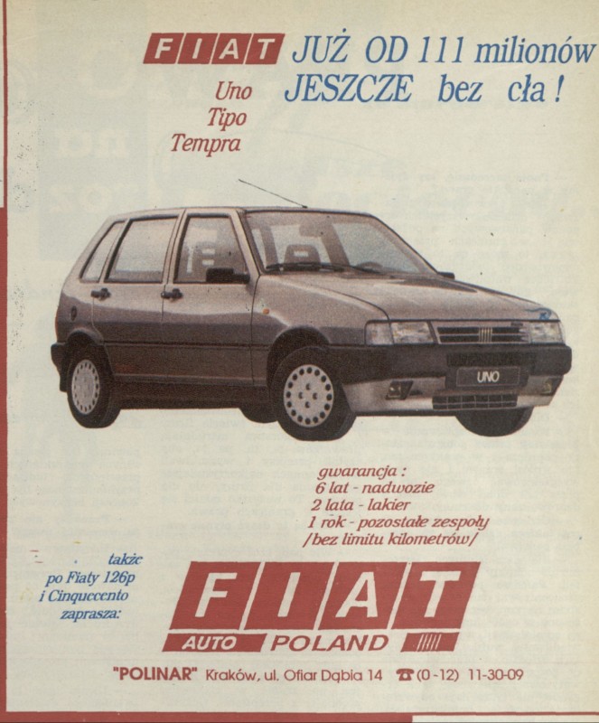 Archiwum / Reklamy nr 2490 (11/1993) 103755/123969 Podziel się Tytuł [Reklama] Rubryka Reklamy Artykuł z numeru 2490 (11/1993) Data wydania 14 marca 1993 Tagi fiat reklama uno