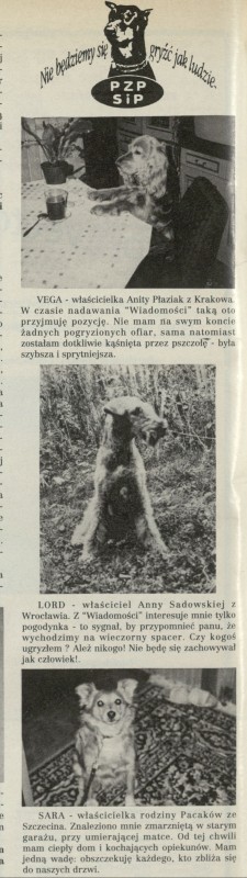 Archiwum / Różności nr 2490 (11/1993) 103784/123969 Podziel się Tytuł Nie będziemy się gryźć jak ludzie Kategoria Różności Artykuł z numeru 2490 (11/1993) Data wydania 14 marca 1993 Tagi PZP SiP psy