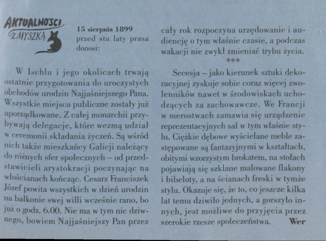 Archiwum / Aktualności z myszką nr 2825 (28/1999) 59/59 Podziel się Tytuł Aktualności z myszką Rubryka Aktualności z myszką Artykuł z numeru 2825 (2826/1999) Data wydania 15 sierpnia 1999 Tagi Ischl secesja