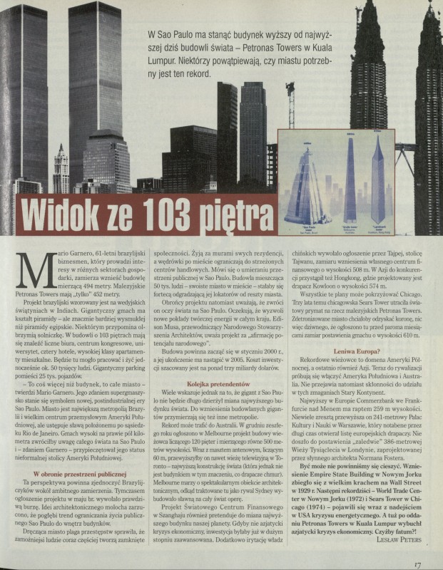 Archiwum / Artykuł nr 2829 (28/1999) 06/1546 Podziel się Tytuł Widok ze 103 piętra Autor Lesław Peters Kategoria Artykuł Artykuł z numeru 2829 (2830/1999) Data wydania 12 września 1999 Tagi wieżowce