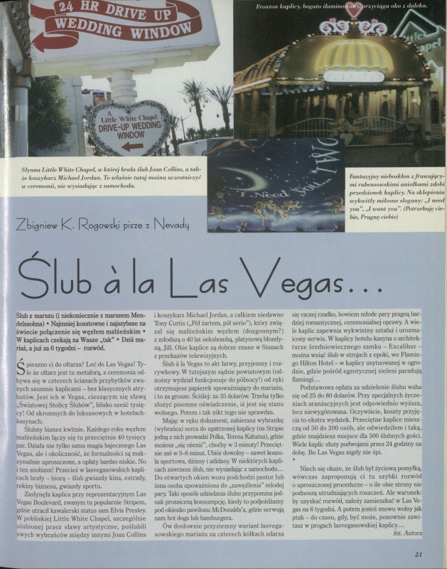 Archiwum / Relacja nr 2829 (28/1999) 15/28 Podziel się Tytuł Ślub a'la Las Vegas Autor Zbigniew K. Rogowski Kategoria Relacja Artykuł z numeru 2829 (2830/1999) Data wydania 12 września 1999 Tagi młoda para