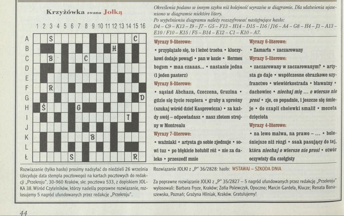 Archiwum / Krzyżówka nr 2830 (28/1999) 123006/123969 Podziel się Tytuł Krzyżówka zwana Jolką Rubryka Krzyżówka Artykuł z numeru 2830 (2831/1999) Data wydania 19 września 1999 Tagi rozrywka zdrowa i tania
