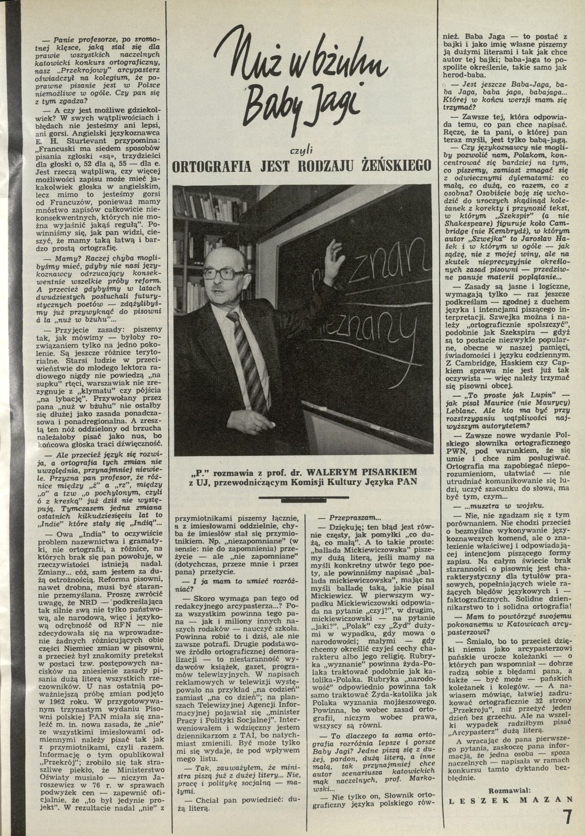 Archiwum / Rozmowy „Przekroju” nr 2492 (13/1993) 103866/123969 Podziel się Tytuł Nuż w bżuhu Baby Jagi Autor Leszek Mazan Rubryka Rozmowy „Przekroju” Artykuł z numeru 2492 (13/1993) Data wydania 28 marca 1993 Tagi Walery Pisarek UJ Komisja Kultury Języka Pan ortografia