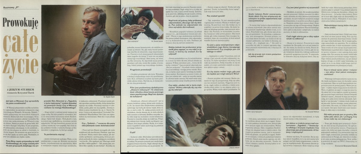 Archiwum / Rozmowy „Przekroju” nr 2836 (28/1999) 1104/1111 Podziel się Tytuł Prowokuję całe życie Autor Krzysztof Żurek Rubryka Rozmowy „Przekroju” Artykuł z numeru 2836 (2837/1999) Data wydania 31 października 1999 Tagi Jerzy Stuhr aktor film Krzysztof Kieślowski "Tydzień z życia mężczyzny" "Historie miłosne" kinematografia polska
