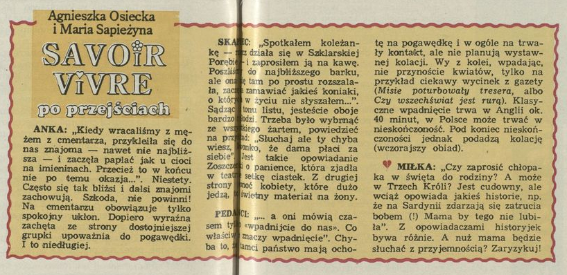Archiwum / Społeczeństwo nr specjalny 49/1993 14/238 Podziel się Tytuł Savoir-vivre po przejściach Autor Agnieszka Osiecka, Maria Sapieżyna Kategoria Społeczeństwo Artykuł z numeru nr specjalny 49/1993 Data wydania 5 grudnia 1993 Tagi kultura obyczaje dobre wychowanie bon ton