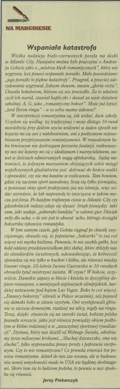 Archiwum / Felieton nr specjalny 2842/1999 2415/2421 Podziel się Tytuł Wspaniała katastrofa Autor Jerzy Piekarczyk Kategoria Felieton Artykuł z numeru nr specjalny 2842/1999 Data wydania 5 grudnia 1999 Tagi felieton Andrzej Gołota