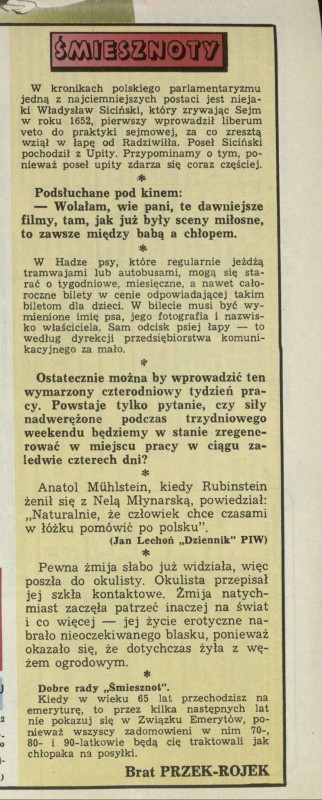 Archiwum / Rozrywka nr 2492 (13/1993) 553/2193 Podziel się Tytuł Śmiesznoty Autor Brat PRZEK-ROJEK Kategoria Rozrywka Artykuł z numeru 2492 (13/1993) Data wydania 28 marca 1993 Tagi Śmiesznoty