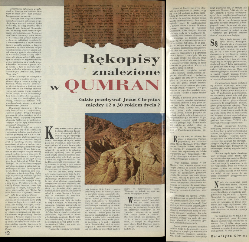 Archiwum / Reportaż nr 2493 (14/1993) 39/59 Podziel się Tytuł Rękopisy znalezione w Qumran Autor Katarzyna Siwiec Kategoria Reportaż Artykuł z numeru 2493 (14/1993) Data wydania 4 kwietnia 1993 Tagi Qumran Jezus Chrystus biblia Emberto Eco Imię róży