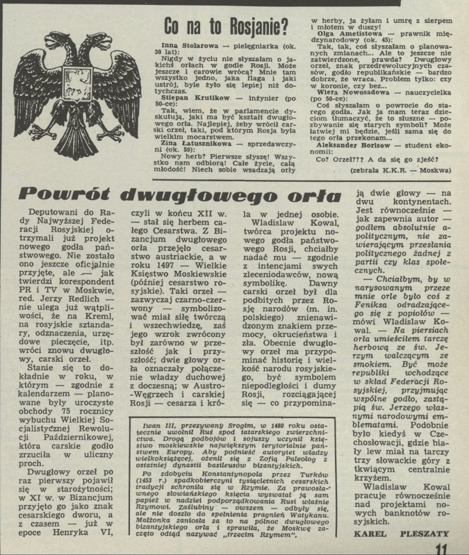 Archiwum / Artykuł nr 2446 (24/1992) 47/158 Podziel się Tytuł Powrót dugłowego orła Autor Karel Pleszaty Kategoria Artykuł Artykuł z numeru 2446 (2447/1992) Data wydania 10 maja 1992 Tagi Rosja księstwo