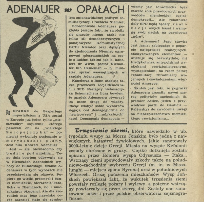 Archiwum / Artykuł nr 437 (34/1953) 51/2307 Podziel się Tytuł Adenauer w opałach Kategoria Artykuł Artykuł z numeru 437 (34/1953) Data wydania 23 sierpnia 1952