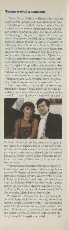 Archiwum / Kultura nr 2697 (09/1997) 115099/123969 Podziel się Tytuł Tarnowi a muzom Kategoria Kultura Artykuł z numeru 2697 (9/1997) Data wydania 2 marca 1997 Tagi Teresa Kaban Henryk Błażej Tarnów