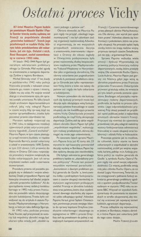 Archiwum / korespondencja własna "Przekroju" nr 2697 (09/1997) 22/121 Podziel się Tytuł Ostatni proces Vichy Autor Marta Tobiasz-Jouheir Rubryka korespondencja własna "Przekroju" Artykuł z numeru 2697 (9/1997) Data wydania 2 marca 1997 Tagi Maurice Papon zbrodnie przeciwko ludzkości