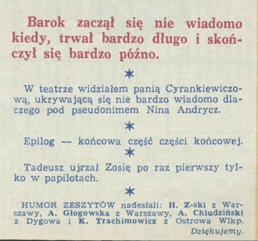 Archiwum / Humor zeszytów szkolnych nr specjalny 42/1993 36/44 Podziel się Tytuł [Barok zaczął się nie wiadomo kiedy...] Rubryka Humor zeszytów szkolnych Artykuł z numeru nr specjalny 42/1993 Data wydania 17 października 1993 Tagi humor zeszytów szkolnych rozrywka