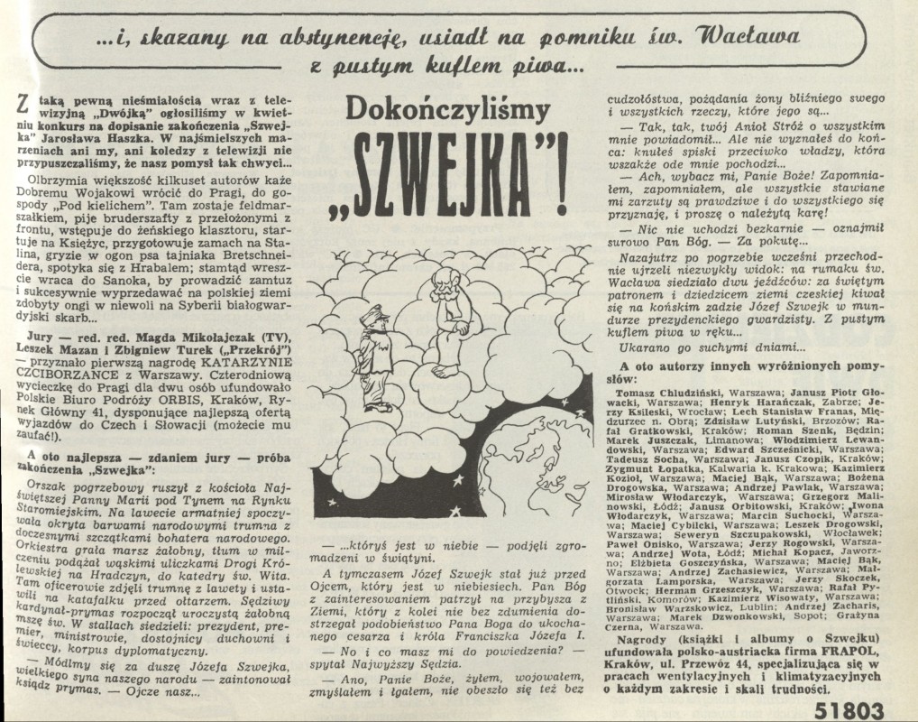 Archiwum / Kultura nr 2500 (21/1993) 104275/123969 Podziel się Tytuł Dokończyliśmy „Szwejka” Kategoria Kultura Artykuł z numeru 2500 (21/1993) Data wydania 23 maja 1993 Tagi Szwejk Jarosław Haszek św. Wacław